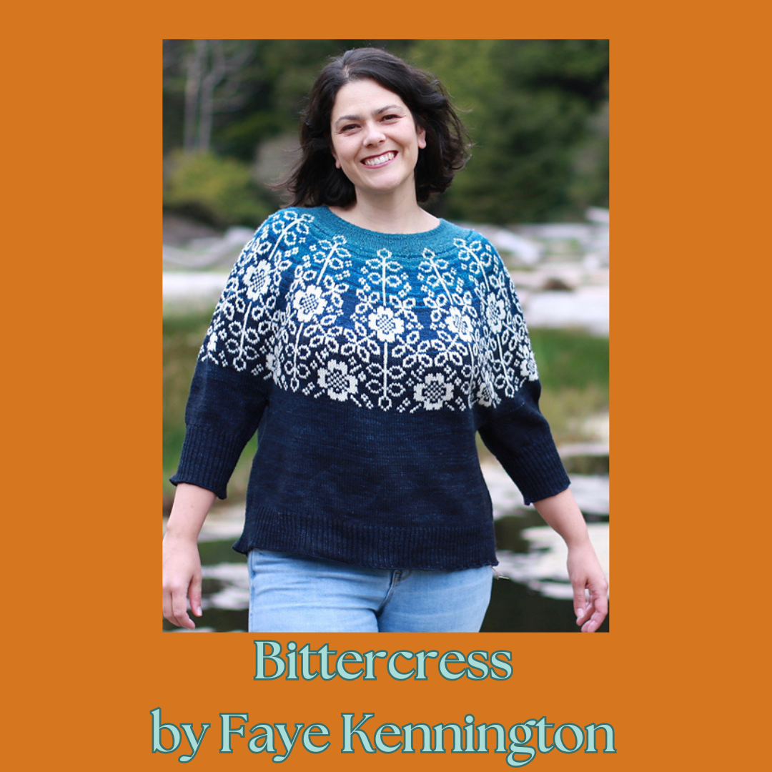 We have several samples of this lovely yarn in the shop. Come by and be inspired by the lovely color work and variety of projects!