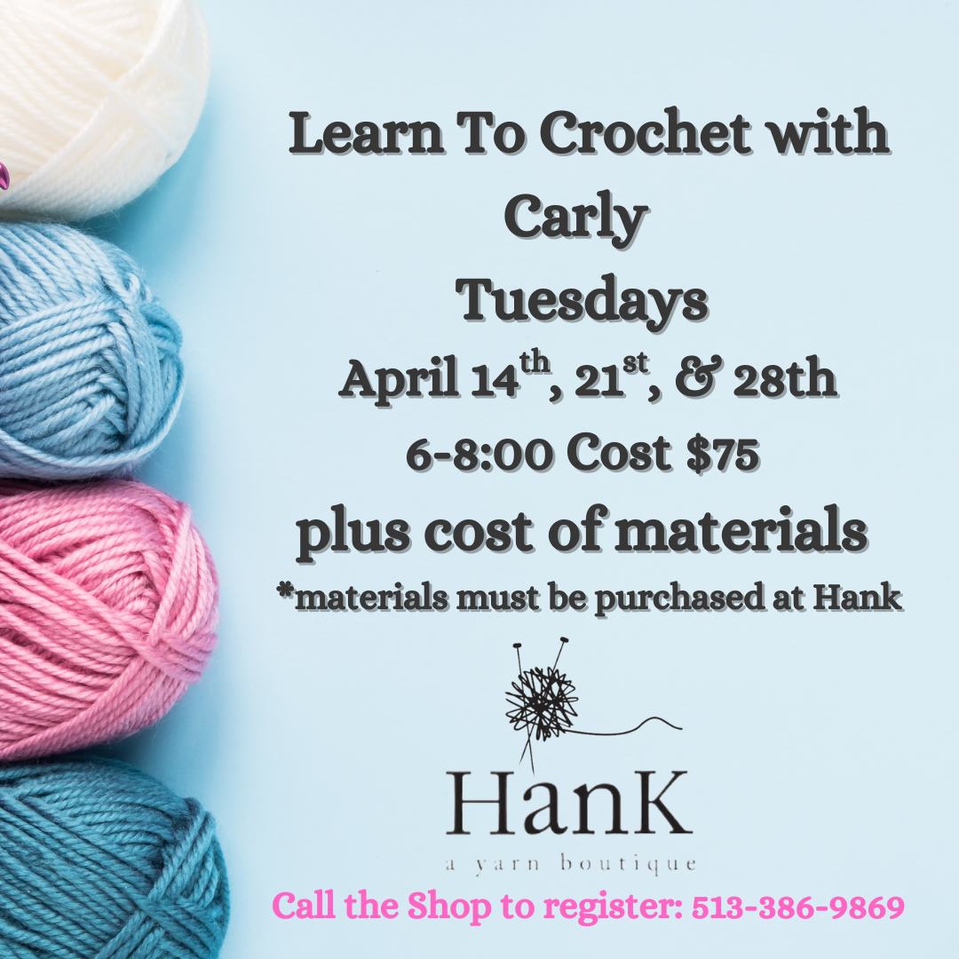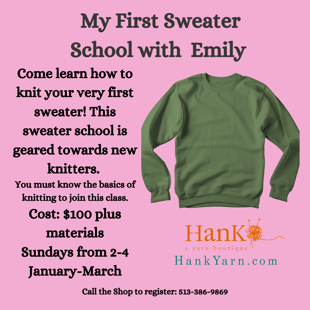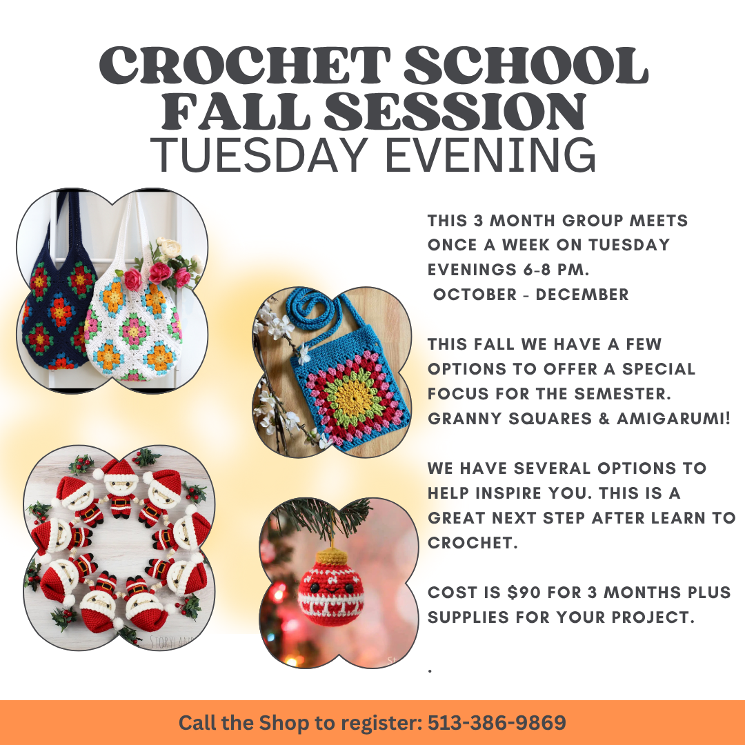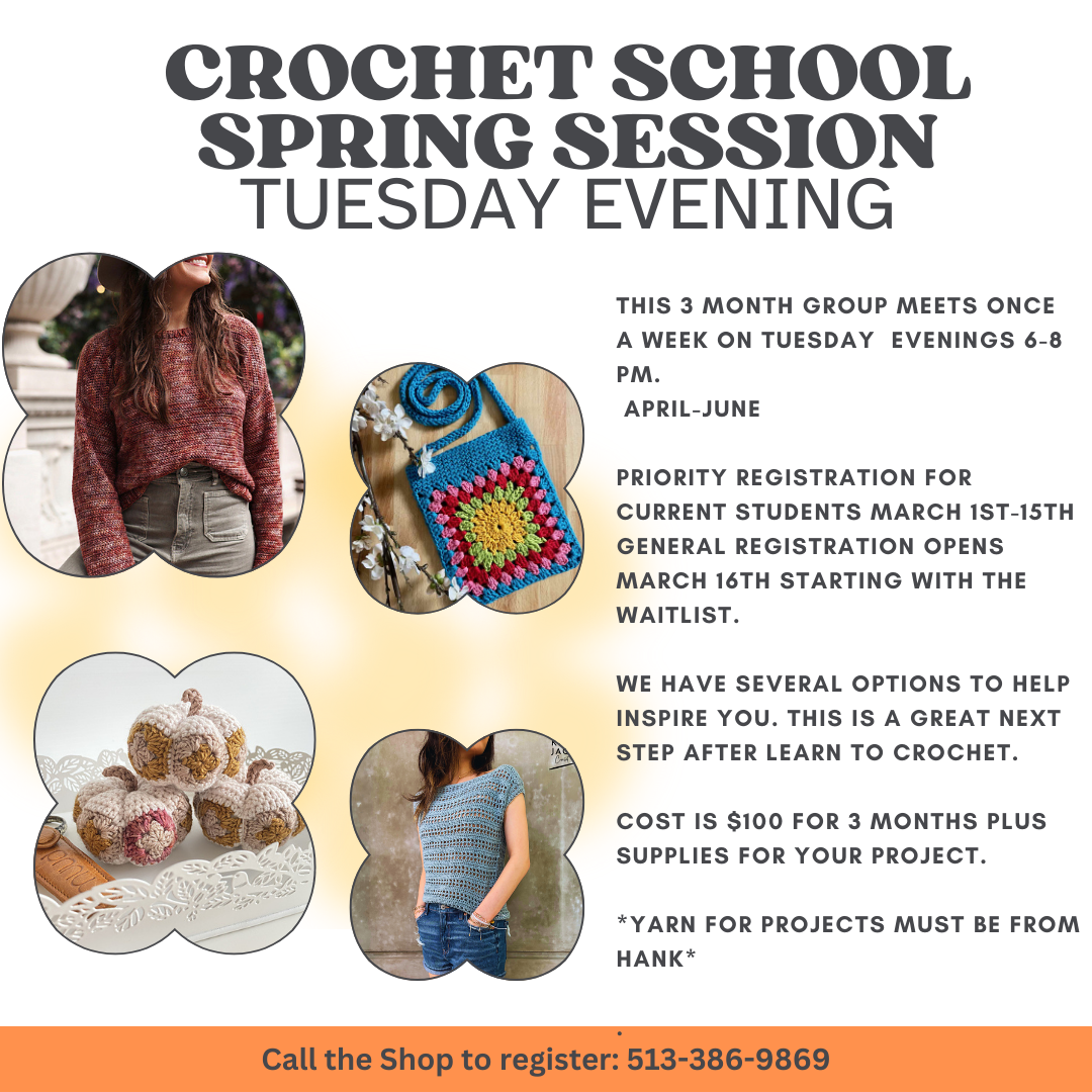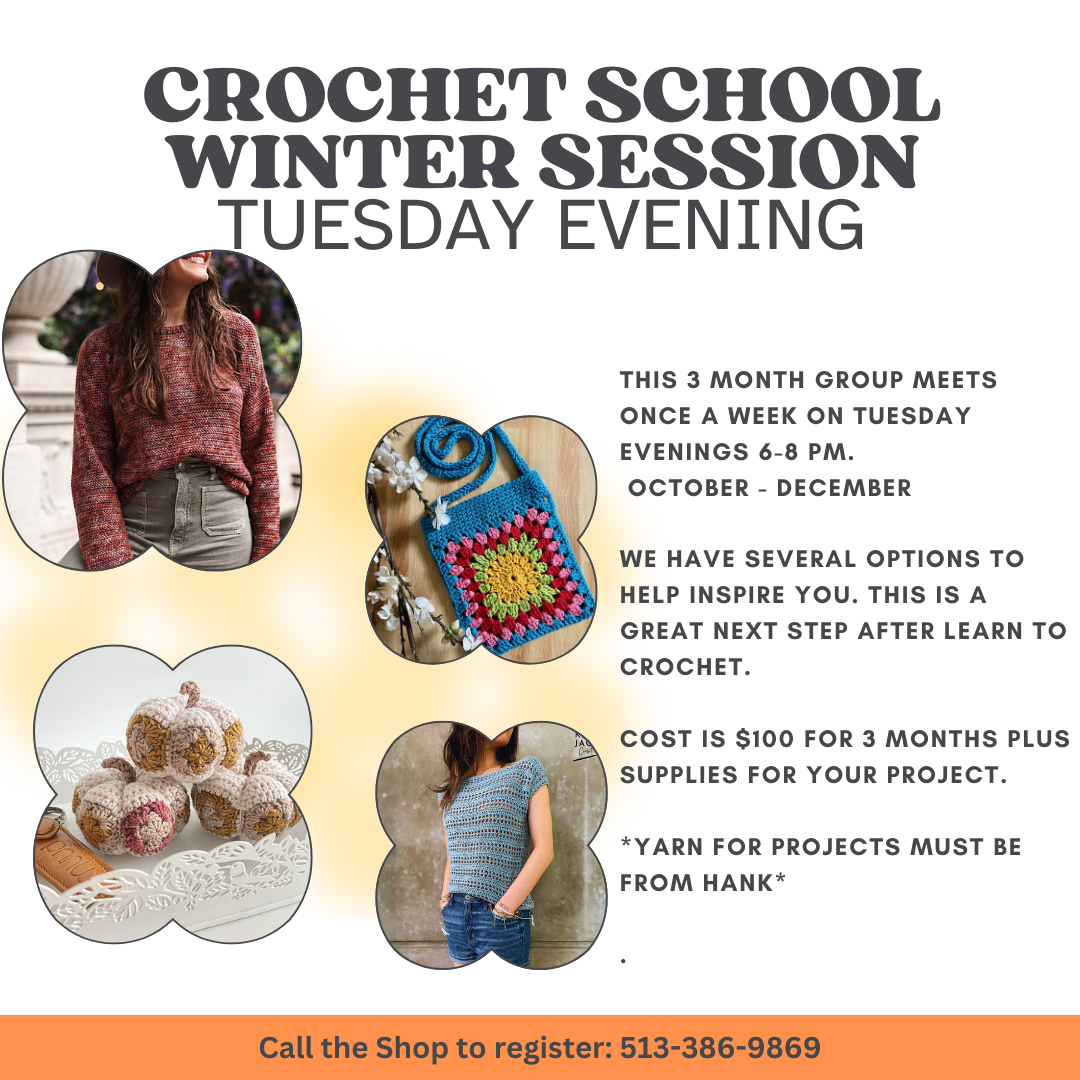 SWEATER SCHOOL CLASS TIMES: MONDAY 11-1 PM/2-4 PM TUESDAYS 11-1 PM WEDNESDAY 11-1PM WEDNESDAY 6:30-8:30 PM THURSDAY 11-1 PM FRIDAY 11-1 PM SATURDAYS 2-4 PM SUNDAYS 2-4 PM Crochet School is on Tuesday Night