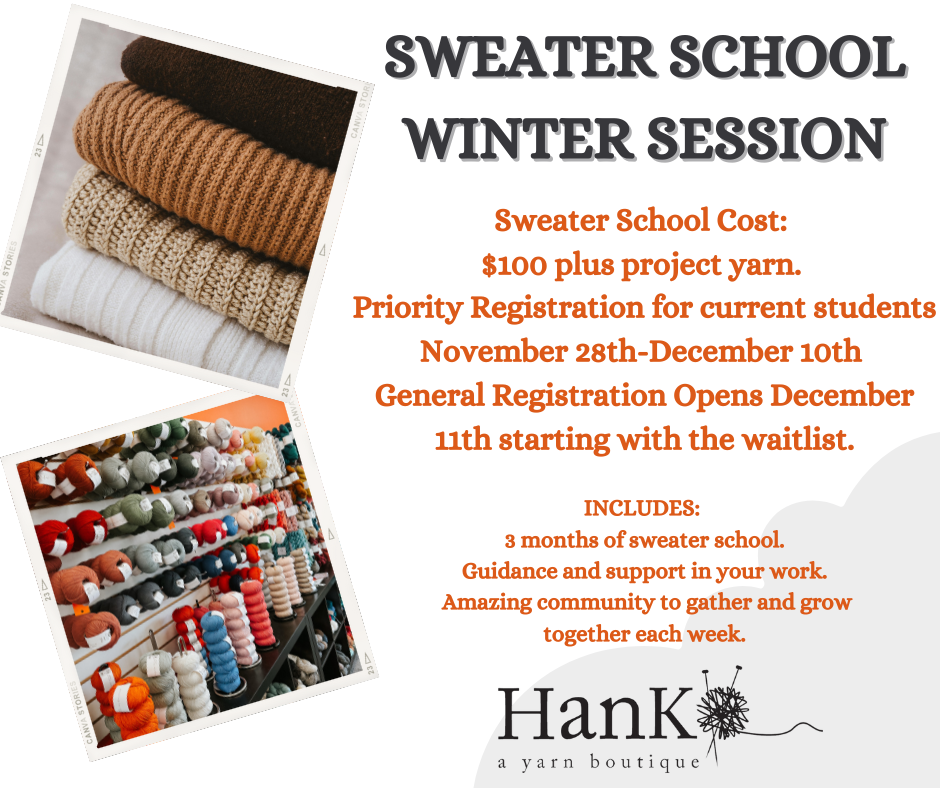 Next Semester of "School" registration is now open.We offer Sweater School, Crochet School, and Sock School.