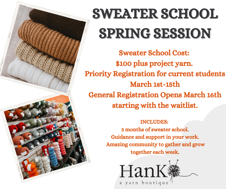 Next Semester of "School" registration is open for Sweater School, Crochet School, & Sock School.